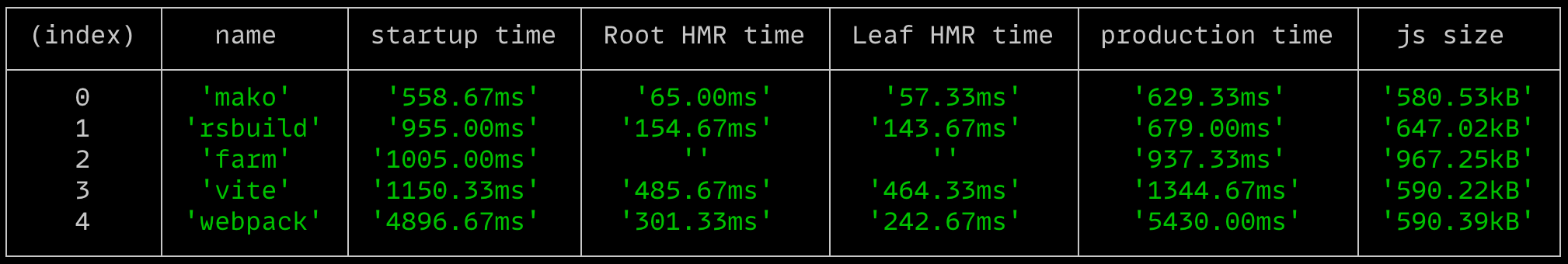 The Benchmark ran on a project that Turbopack also tests, on a Mac Book Pro M2 Max. It includes dimensions such as dev cold start time, root node and leaf node HMR time, production Build build time, and JS bundle size. (Note: Farm was not tried successfully using API mode, so no HMR data was generated; RsBuild had some issues upgrading to 0.7, so it’s still on 0.6 for now. RsBuild 0.7 might be a bit faster.)